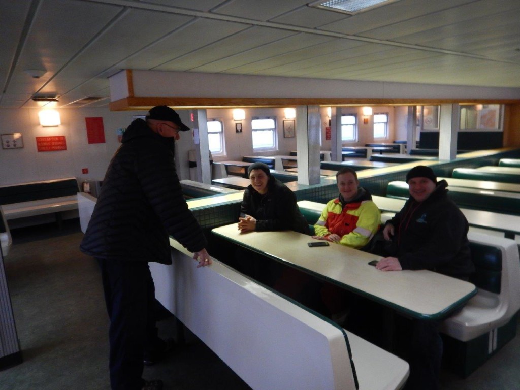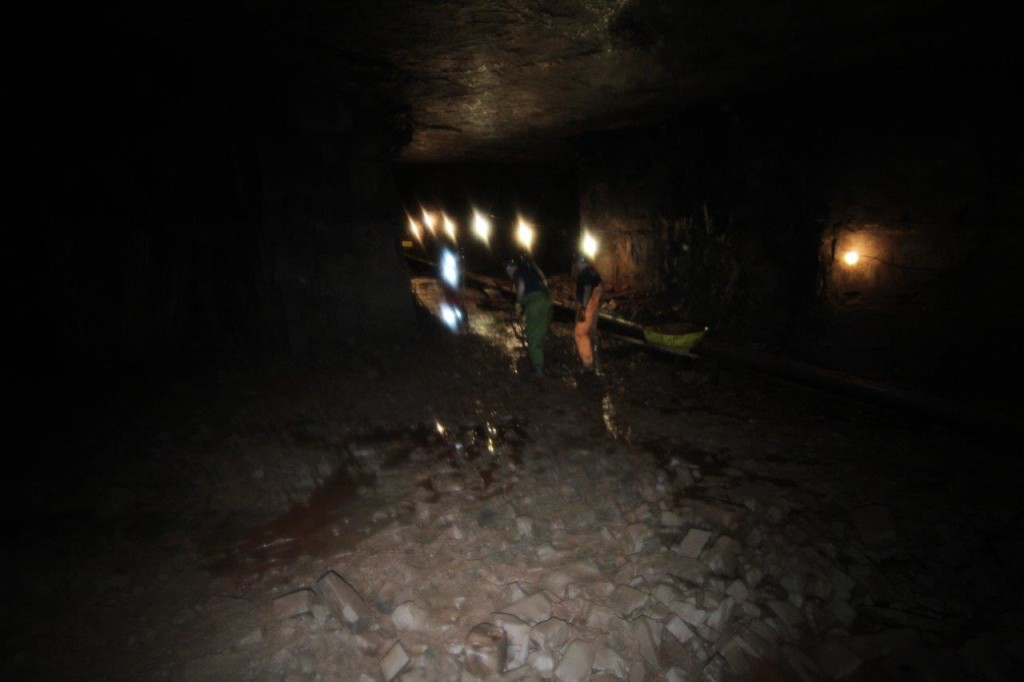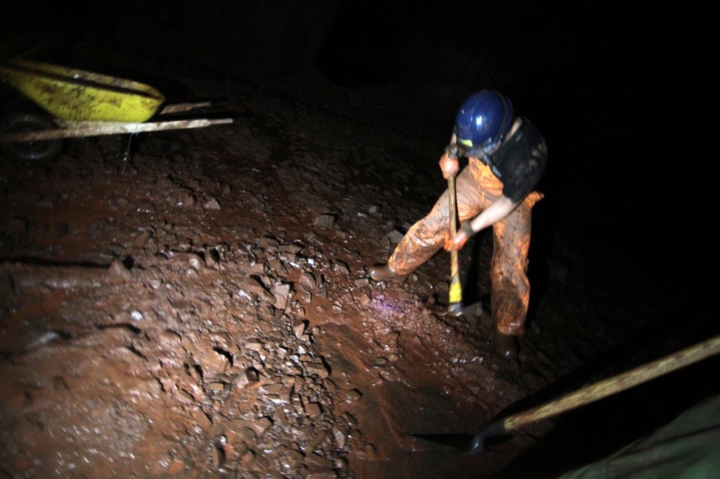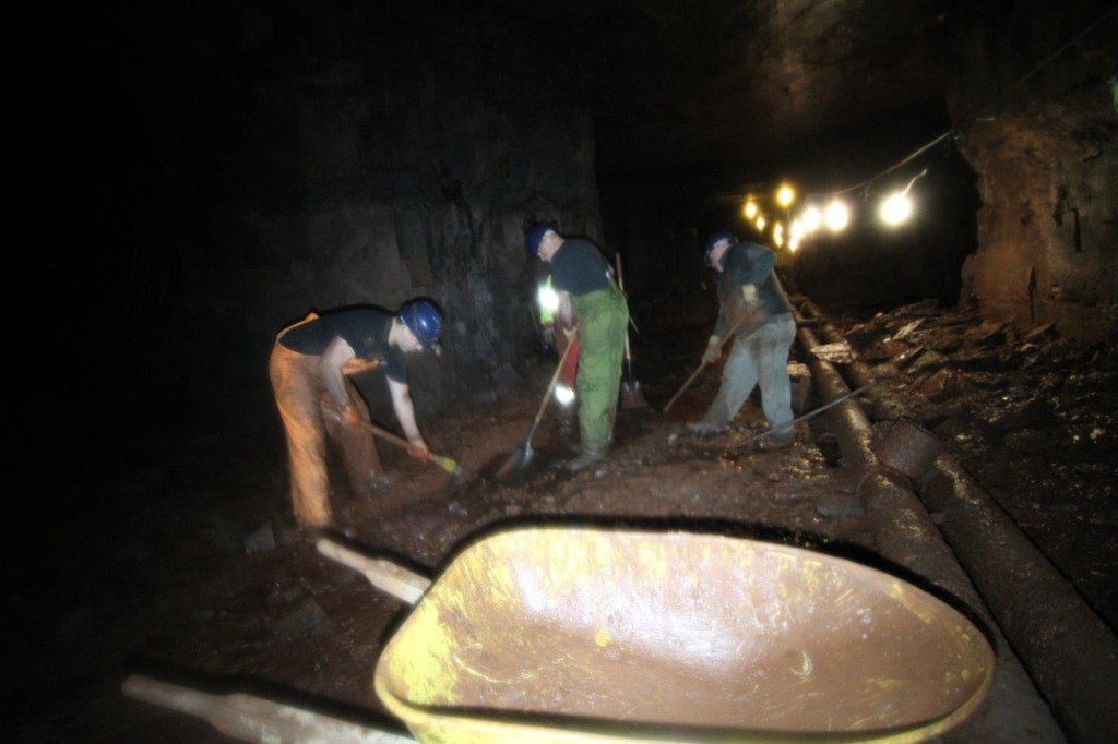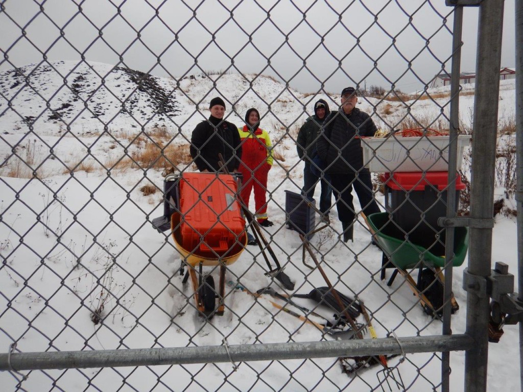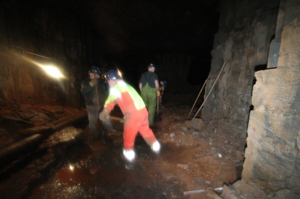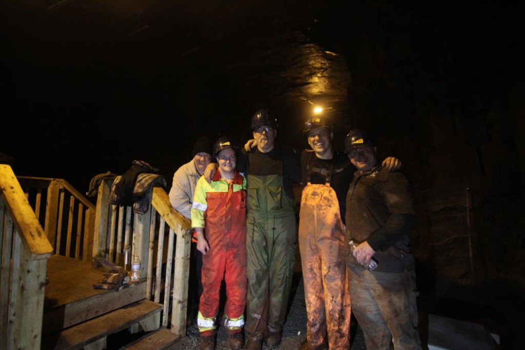 Volunteers Mark ( Magoo) McGowan, John ( Johnny O) Olivero, Nick Dawe, Kyle Morgan and Rick Stanley were hard at work in Bell Island Mine #2 preparing it for the upcoming cave diving expedition in February. Ultimately, they intend to build the infrastructure that will permit safe cave diving operations for qualified visiting divers. Leaving in the early morning hours, the team took the ferry from Portugal Cove to Bell Island and drove to the access point at the Mine #2 Museum. All equipment had to be hand-carried 750 feet down the shaft to the future site of the diving platform. They installed temporary lighting and held safety briefings with master craftsman and Safety Advisor Ron Reid. Reid and the team also identified and removed some loose rock from the ceiling and walls before the heavy work began after lunch. With a solid day of manual labor using shovels and pick axes, everyone developed a new respect for the efforts of the men who worked the mine for a lifetime.